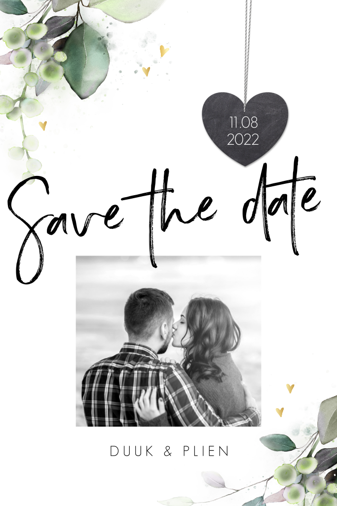 Deze mooie Save the Date kaart met botanisch blad is onderdeel van onze trouwhuisstijl Basic Botanisch. De tekst Save the Date staat in een sierlijk en speels lettertype. Voeg je eigen persoonlijke foto toe. De kleuren en teksten zijn gemakkelijk aan te passen.