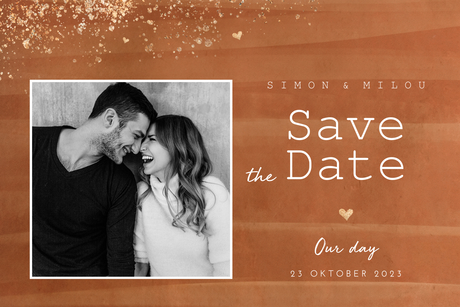 Kondig jullie huwelijk aan met deze hippe Save the Date kaart met foto. Deze kaart heeft een trendy roestbruine achtergrond met goudkleurige spetters en kleine hartjes. Deze Save the Date kaart is onderdeel van onze trouwhuisstijl Roest .