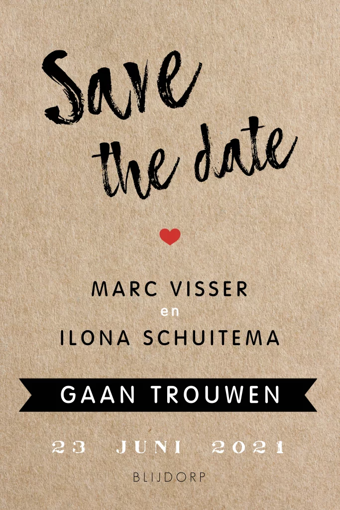 Typografische save the date kaart met kraft kartonnen achtergrond, sierlijke en strakke letters.