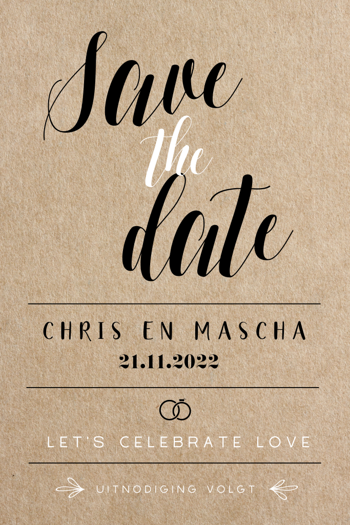 Hippe Save the Date kaart met teksten in verschillende lettertypes op een karton achtergrond. Deze Save the Date kaart is onderdeel van onze trouwhuisstijl Lettering Karton.