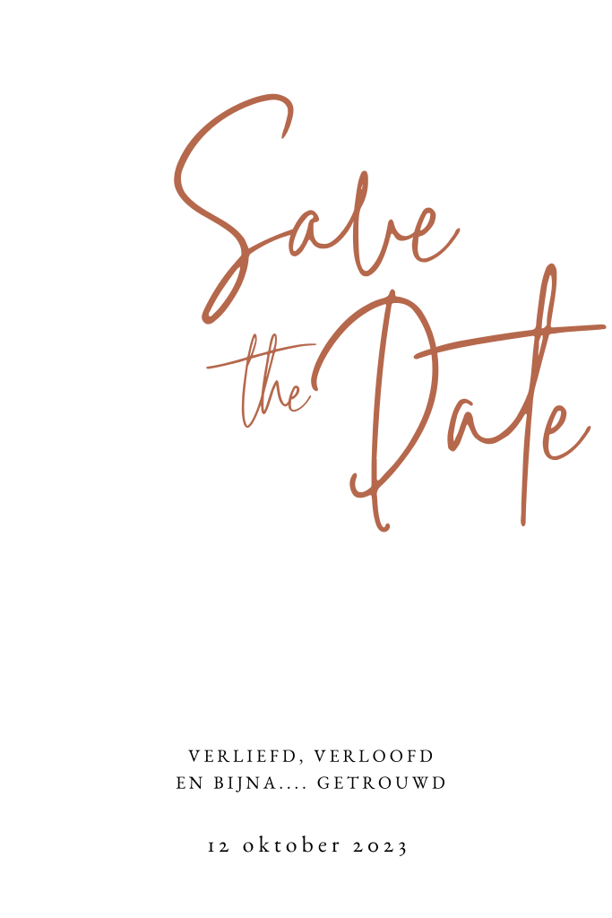 Deze hippe Save the Date kaart is onderdeel van onze trouwhuisstijl Lovely Lettering. Deze kaart is overwegend wit een oogt daardoor clean. De tekst Save the Date staat in een sierlijk en speels lettertype in de trendy kleur roestbruin.