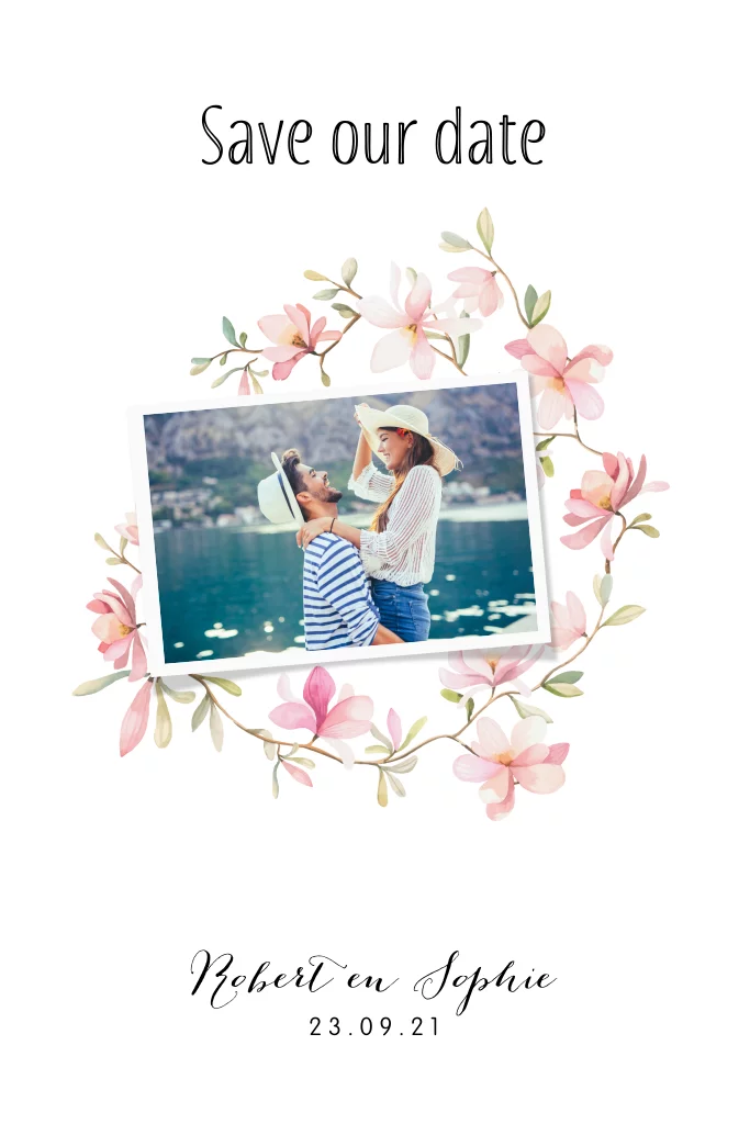 Romantische Save the Date kaart met een bloemen krans van bloesem en een eigen foto. De bloemen lijken op magnolia's ook wel tulpenboom bloemen. De combinatie met de sierlijke letters geven een romantisch tintje aan de kaart.