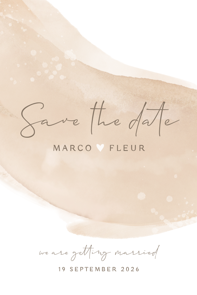 'Save the Date': jullie gaan trouwen! Door dit Save the Date kaartje te versturen, kan iedereen vast jullie trouwdatum vrij houden. Op dit Save the Date kaartje strakke en sierlijke lettertypes en een aquarel veeg op de achtergrond. De afgeronde hoeken maken het kaartje nog een tikje unieker. Teksten en kleuren pas je eenvoudig aan in onze ontwerpmodule.