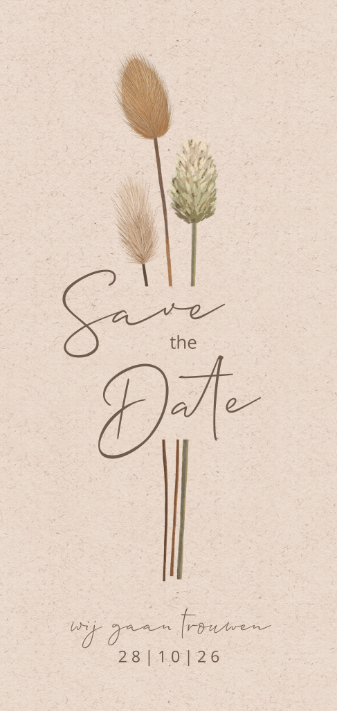 Prachtige Save the Date kaart met afgeronde hoeken. Op deze kaart hippe, trendy droogbloemen met Save the Date ertussen in een sierlijk lettertype. De achtergrond heeft een kartonlook.