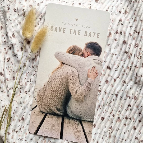 Prachtig Save the Date kaartje! Op deze kaart alle ruimte voor een foto van jullie als verliefd koppel. Deze Save the Date kaart heeft afgeronde hoeken en boven de trouwdatum staat een klein hartje. Teksten, foto en kleuren pas je eenvoudig aan in onze ontwerpmodule. Hulp nodig? Laat het ons weten!