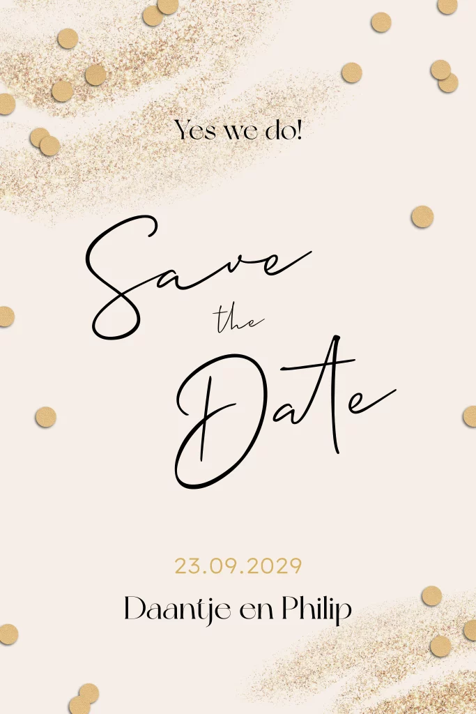 Kondig jullie huwelijk aan met deze hippe en feestelijke save the date kaart. Deze kaart is voorzien van sierlijke letters en goudkleurige confetti. Er zijn verschillende lettertypes gebruikt wat een speels effect geeft.
