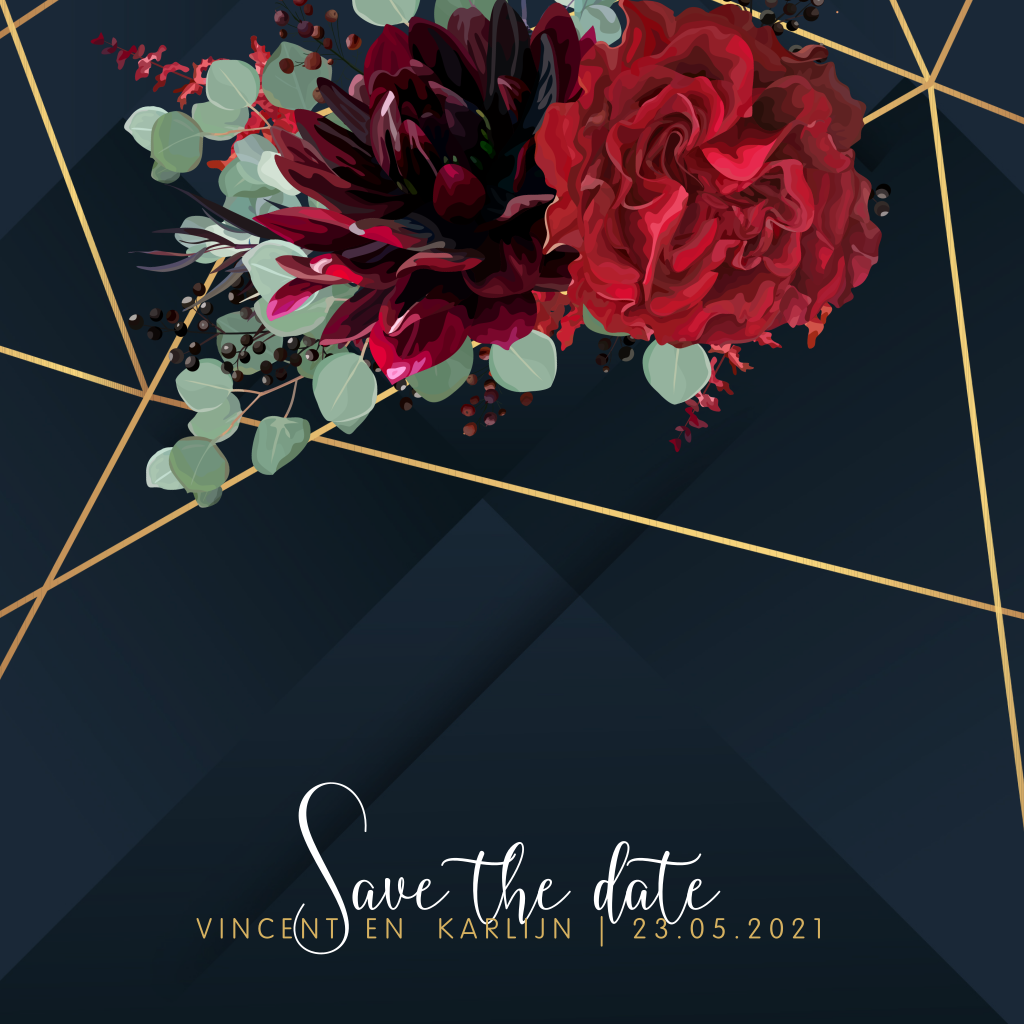 Stijlvolle moderne save the date kaart. Deze stijlvolle kaart is voorzien van geometrische lijnen in goud tint en rode bloemen.