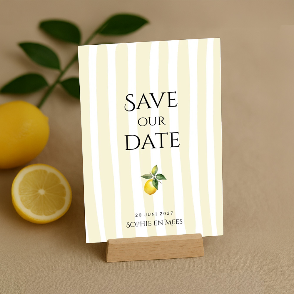 Een stijlvolle Save the Date kaart met een gestreepte achtergrond en een illustratie van een citroentje. Teksten en kleuren van deze kaart zijn makkelijk aan te passen in onze online editor. Maak deze Save the Date uitnodiging helemaal in stijl af met de donkergroene envelopkleur. Een perfecte kaart om je gasten alvast in stijl uit te nodigen voor jullie bijzondere dag.