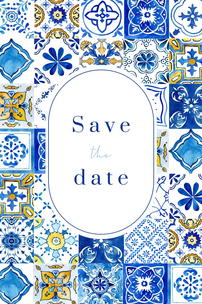 Wanneer je net verloofd bent, is het tijd om je bruiloft te gaan plannen. Een van de eerste dingen die je moet doen, is je gasten uitnodigen met een mooie Save the Date kaart. Wij hebben de perfecte kaart voor jou, met een patroon van mediterrane tegeltjes. In de ovalen vorm staat de tekst. Deze Save the Date kaart past perfect bij een buitenlandse bruiloft. Je kunt deze kaart zelf bewerken in de editor en naar je eigen wensen aanpassen.