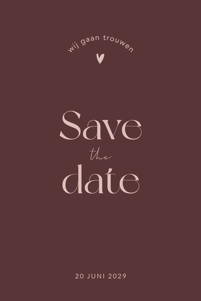 Eenvoudige Save the Date kaart in trendy burgundy kleur. Deze Save the Date kaart heeft een basic ontwerp maar door de warme kleuren valt het zeker wel op. Pas deze kennisgevingskaart geheel naar eigen wens aan in de editor, zodat het precies bij jullie bruiloft past. Vragen? Laat het ons weten!