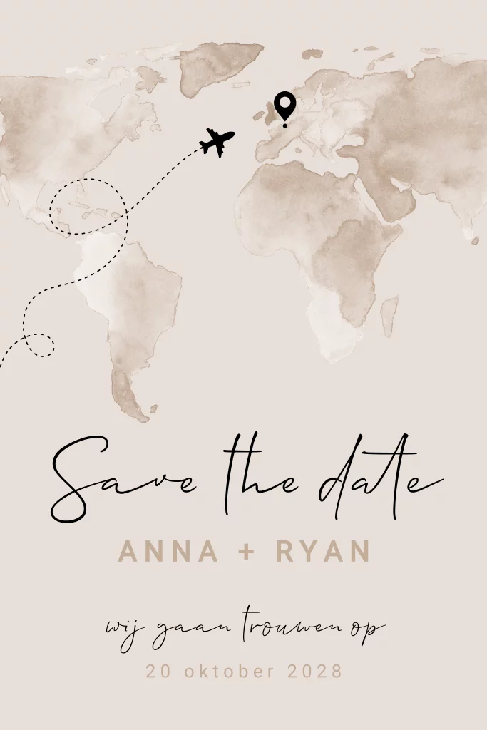 "Save the date": laat dit al je gasten weten met deze trendy Save the Date kaart met een wereldkaart. Op deze trouwkaart zie je een wereldkaart met een vliegtuigje en een gepinde locatie in rustige beige tinten. Deze Save the Date kaart past goed bij een reislustig stel! Teksten en kleuren pas je gemakkelijk aan in onze online editor.
