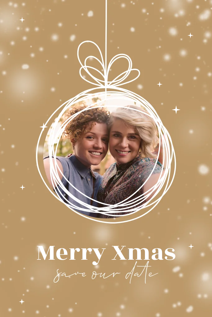 Save the Date kerstkaart met sprankelende sneeuw en kerstbal. Zet in de kerstbal een foto van jullie zelf als stralend verloofd stel. De goudfolie en ronde hoeken maken dat de kaart echt opvalt. Kleuren en lettertypes zijn aan te passen in de editor.