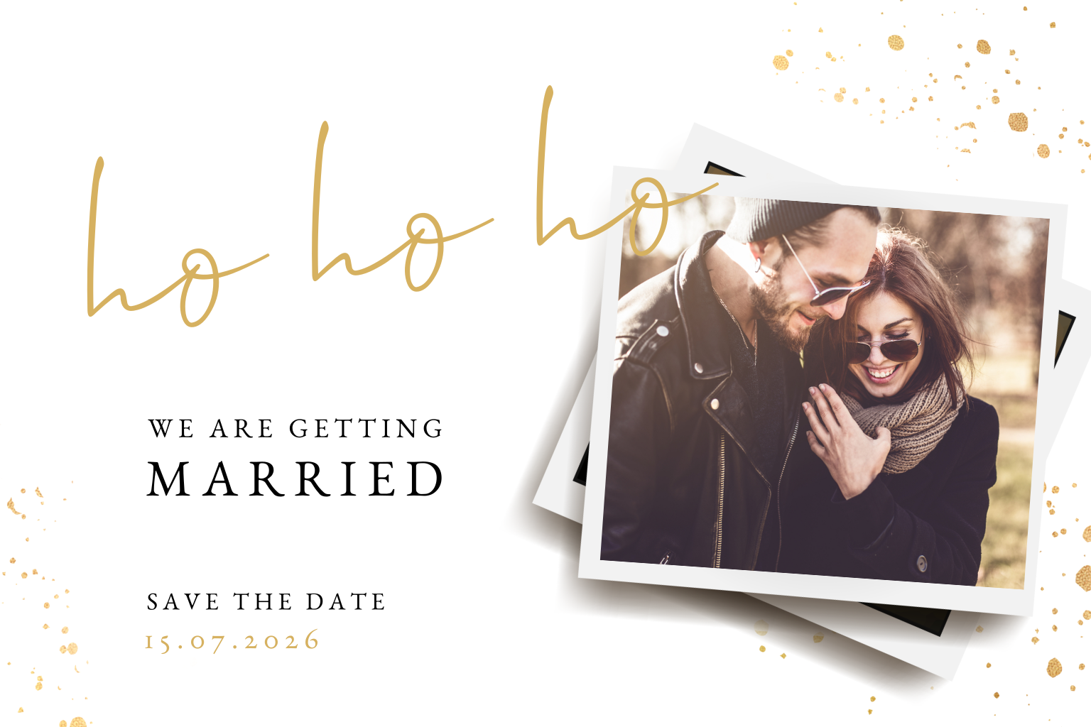Ho Ho Ho Save de date kerstkaart om al je familie en vrienden te laten weten dat jullie in het nieuwe jaar gaan trouwen. Op deze kaart voeg je een eigen persoonlijke foto toe.