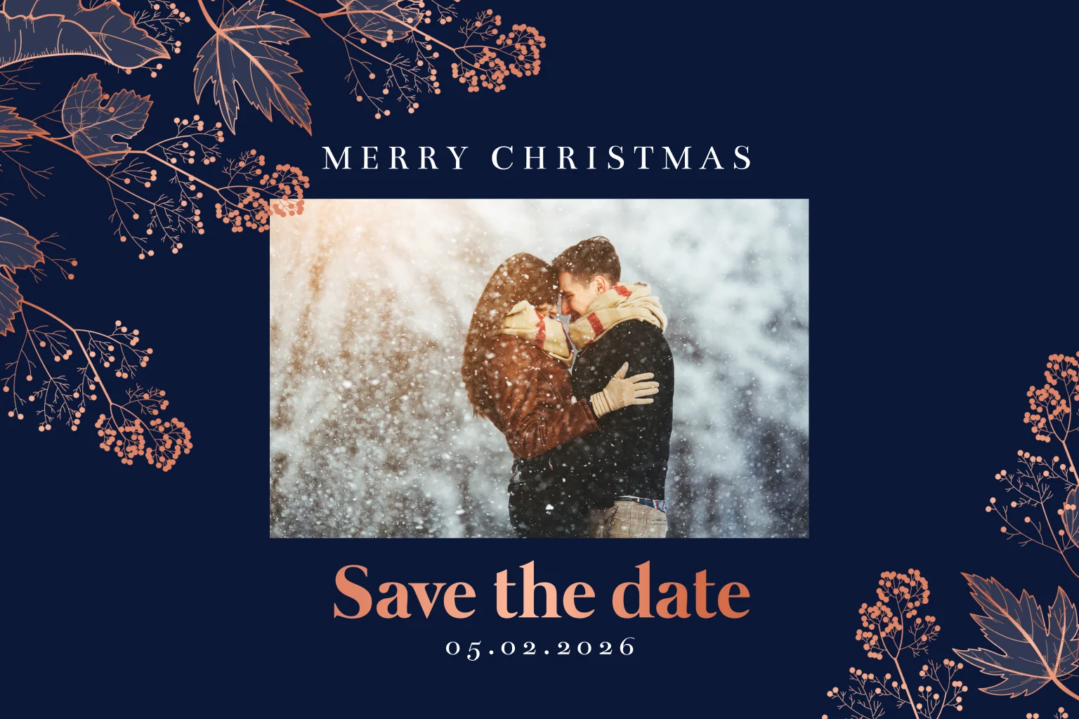 Stijlvolle Save the Date kerstkaart om met de feestdagen de datum van jullie voorgenomen huwelijk aan te kondigen. Op deze romantische kaart staan sierlijke takken en plaats je je eigen persoonlijke foto.