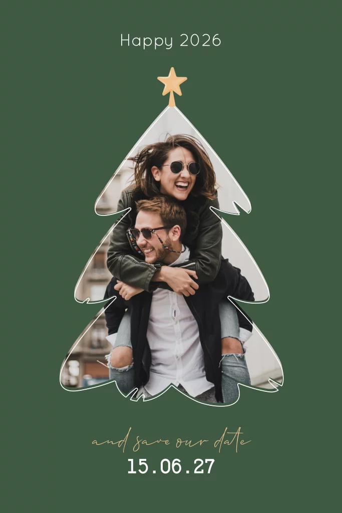 Wens familie en vrienden een happy 2026 en vraag ze meteen de datum van jullie voorgenomen huwelijk vrij te houden. Op deze Save the Date kerstkaart staat een kerstboom waarin je een eigen foto kunt plaatsen van jullie als stralend stel. De ronde hoeken maken het kaartje helemaal compleet. Pas de teksten en lettertypes gemakkelijk aan in de editor.