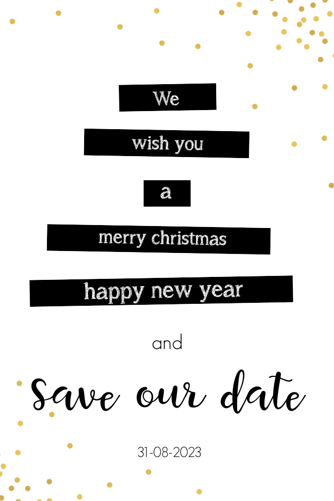 Hippe Save the date kerstkaart om tijdens de feestdagen jullie huwelijk aan te kondigen! Deze kaart is overwegend zwart wit, gedecoreerd met goudkleurige confetti.