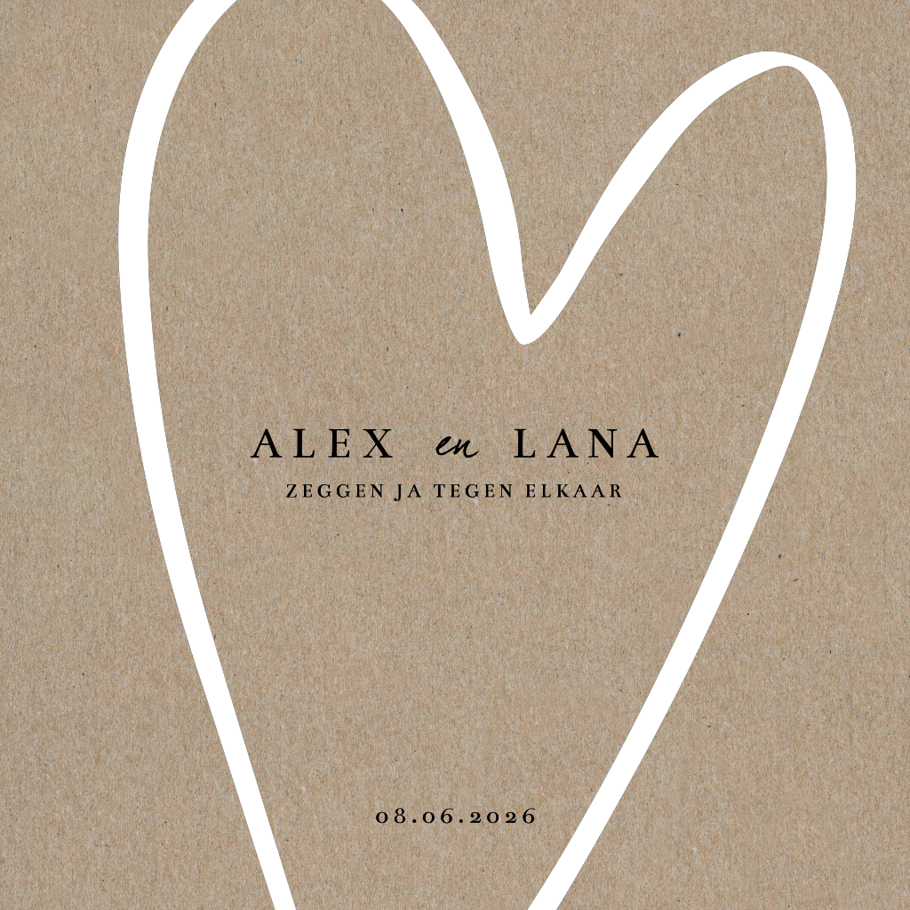 Basic trouwkaart op écht kraftpapier met een groot wit hart. Hierin staan de namen van het toekomstige bruidspaar in een strak lettertype. Je kunt deze huwelijksuitnodiging zelf bewerken in de editor en naar je eigen smaak aanpassen.