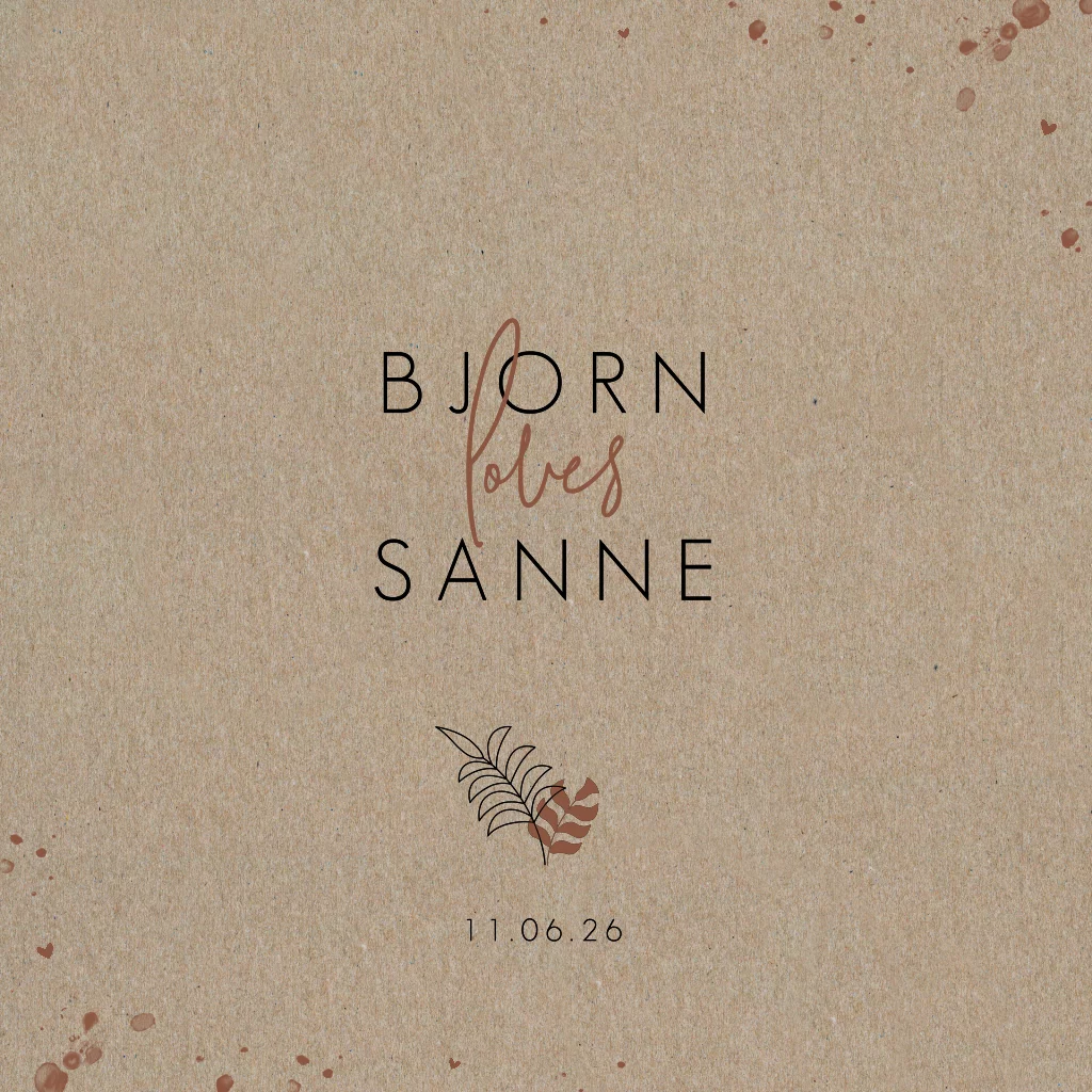 Deze huwelijksuitnodiging wordt gedrukt op écht kraftpapier en heeft een rustig design met 2 kleine takjes en spetters. De teksten en lettertypes zijn aan te passen in de editor.
