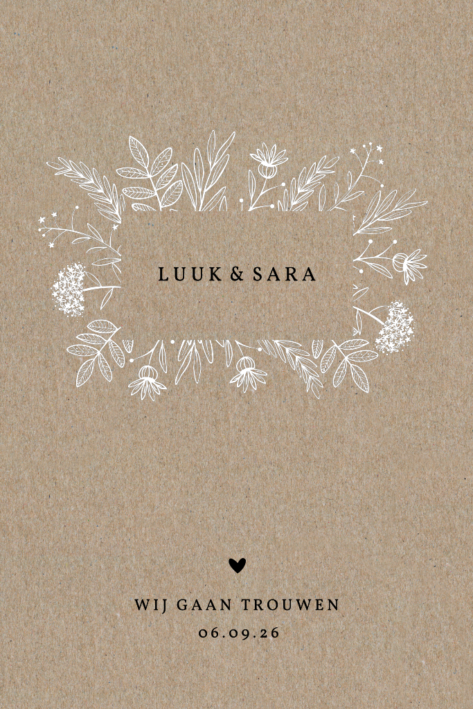 Kondig jullie huwelijk aan met deze mooie trouwkaart op écht kraft papier. De namen van het bruidspaar staan centraal op de kaart met daaromheen mooie bloem takjes. Pas de teksten en lettertypes naar wens aan in de editor.