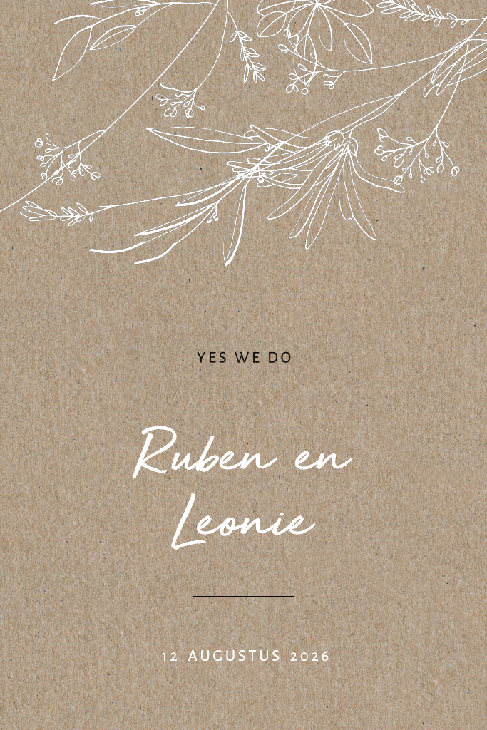 Trouwkaart met mooie getekende bloemen op écht kraft papier. Pas de teksten en lettertypes naar wens aan in de editor.
