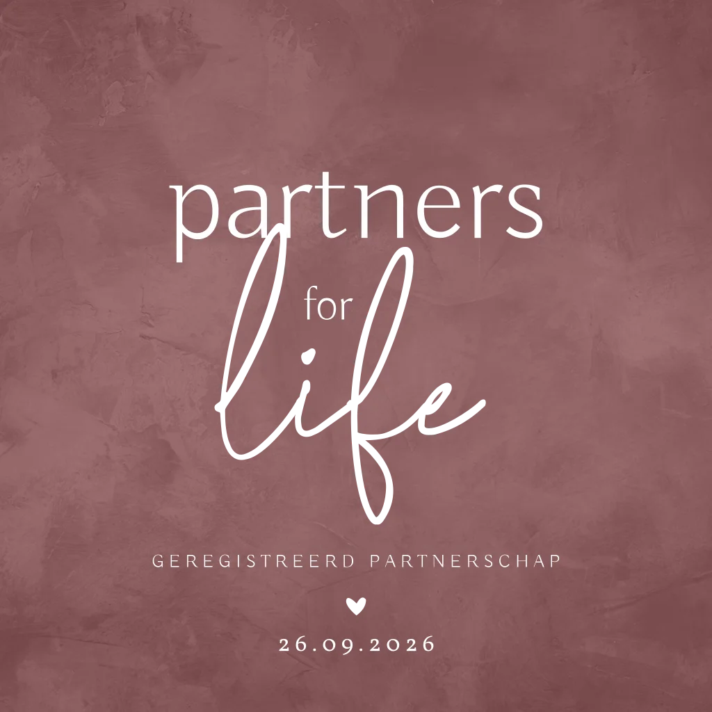 Deze uitnodigingskaart met gouden foliedruk is een populaire en chique keuze, die perfect past bij een luxe en stijlvol feestje. Op deze basic geregistreerd partnerschapskaart met trendy velvet achtergrond staat de tekst 'partners for life' in een mooie kleurcombinatie van goud en wit. Dit kaartje is rustig, maar door de toevoeging van goudfolie krijgt het kaartje echt een extra luxe uitstraling. De kleur van de foliebedrukking kun je in de ontwerpmodule aanpassen.