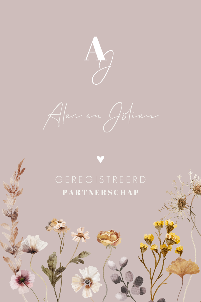 Zeggen jullie Ja tegen elkaar en gaan jullie voor een geregistreerd partnerschap. Zeg het tegen al je gasten met deze stijlvolle uitnodigingskaart. Deze romantische uitnodiging heeft een paarse achtergrond met prachtige aquarel veldbloemen. De sierlijke initialen van het bruidspaar en het hartje worden gedrukt in echt goudfolie, wat deze kaart een luxe uitstraling geeft. Liever koperfolie, zilverfolie of rosfolie? Dit kun je eenvoudig aanpassen in onze editor.