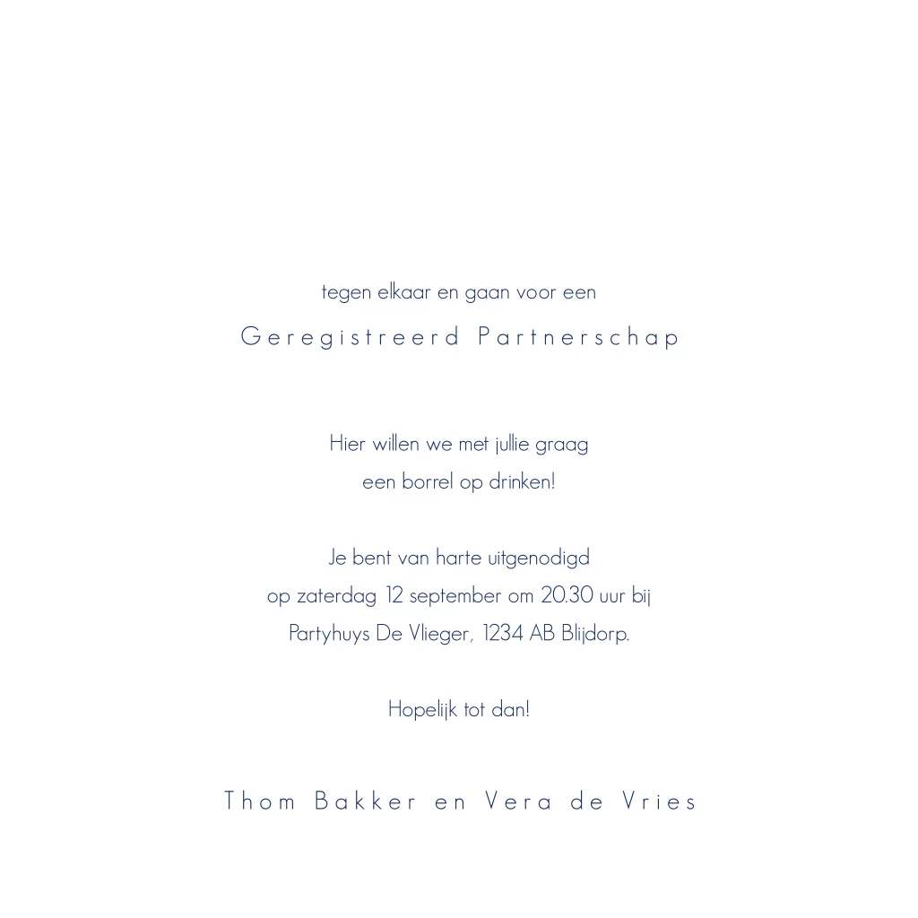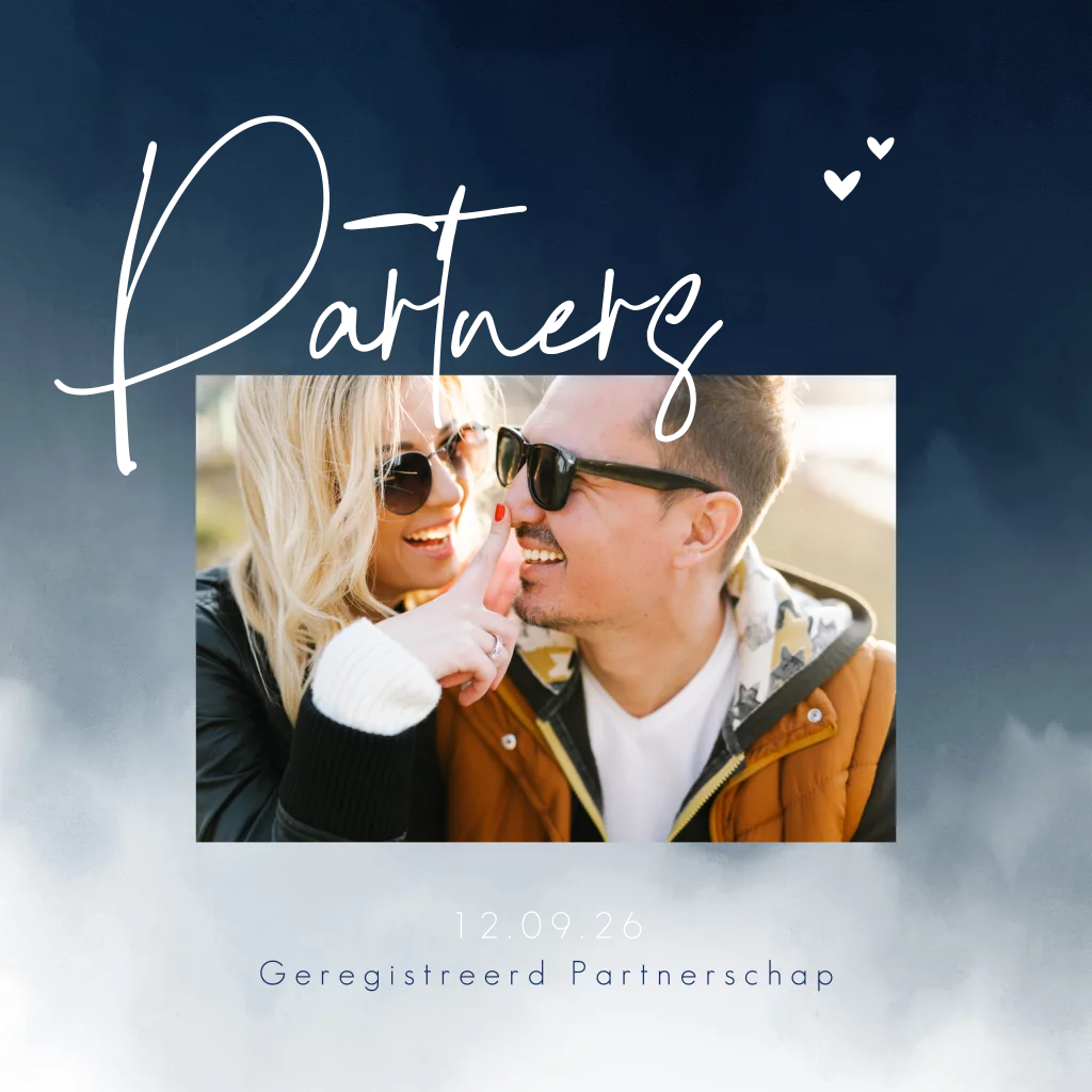 Wat is er chiquer dan een aquarel fotokaart met luxe goudfolie om aan te kondigen dat jullie geregistreerde partners zijn? Deze stijlvolle kaart is perfect voor een uitnodiging of kennisgeving. Je kunt een mooie foto toevoegen en de kleuren en lettertypes naar je eigen smaak aanpassen in de editor. Combineer met een mooie envelop voor het perfecte resultaat. De aquarel achtergrond en eigen foto zijn een echte eyecatcher en zeker een leuk item om te versturen naar je geliefden.