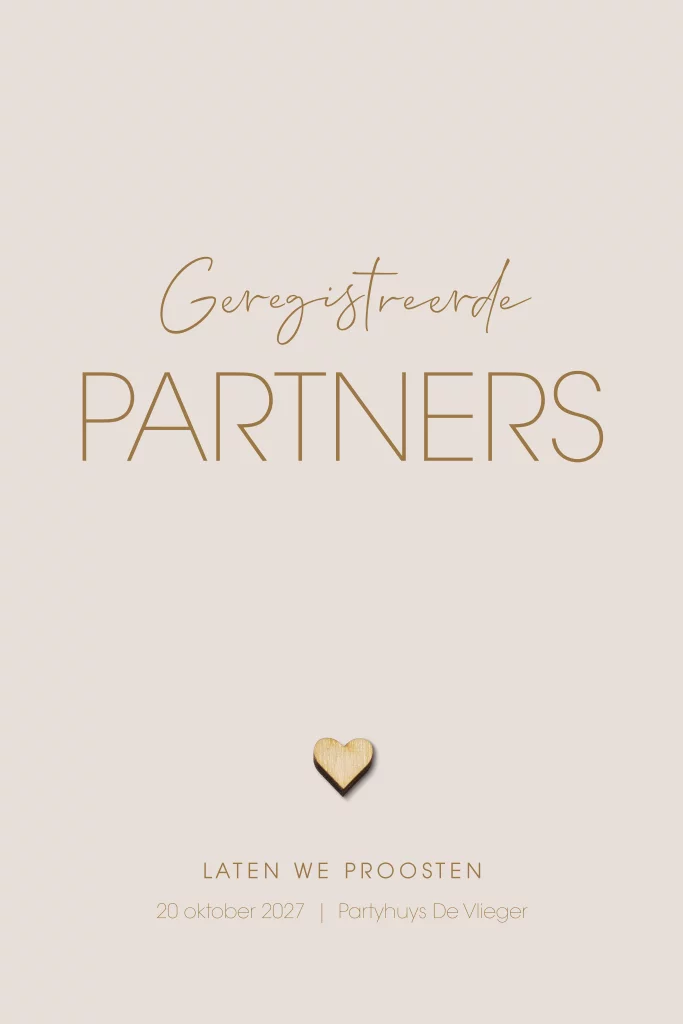 Een eenvoudige trendy geregistreerd partnerschapskaart met een echt houten hartje. Deze uitnodiging heeft een basic design maar het houten hartje maakt de uitnodigingskaart helemaal exclusief. Teksten en kleuren zijn makkelijk aan te passen in onze editor.