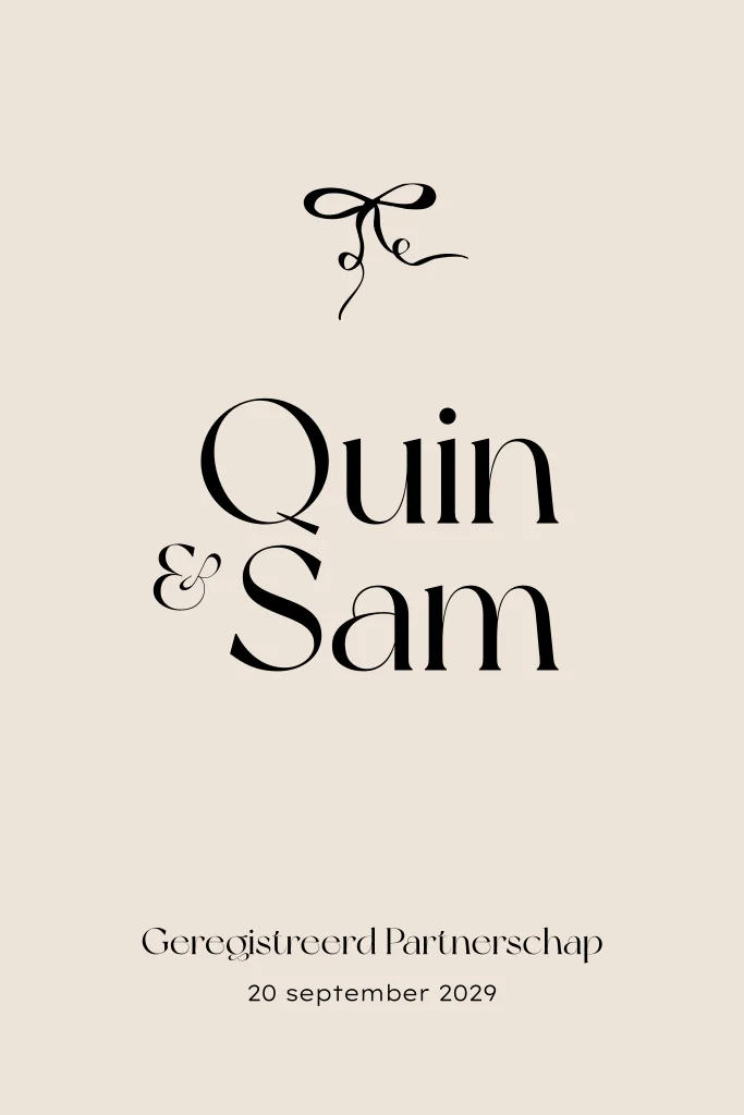 Geregistreerd partnerschap kaart om dit bijzondere moment aan te kondigen. Deze chique geregistreerd partnerschapskaart heeft een beige achtergrondkleur en zwarte teksten. Boven jullie namen staat een strikje. Pas deze kaart naar je eigen wensen aan.
