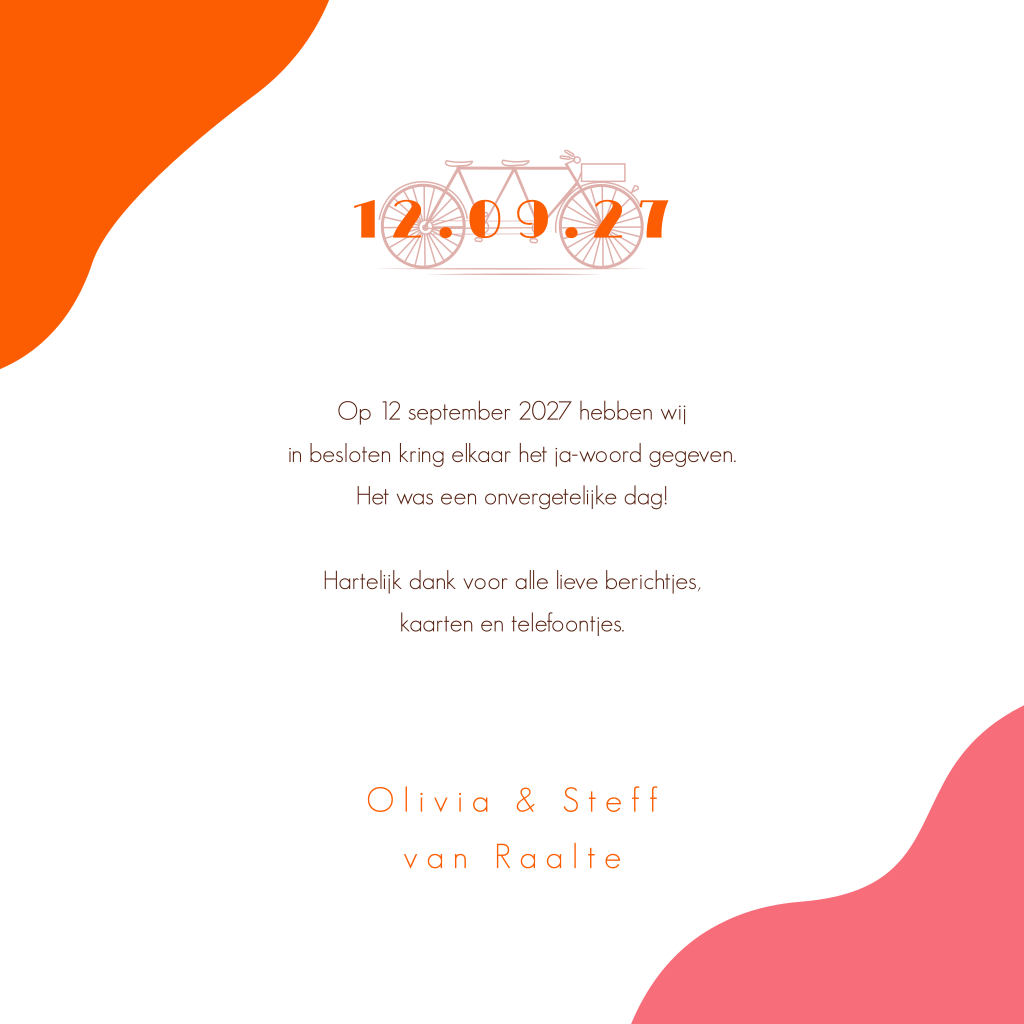 Een kleurrijke kaart om iedereen te laten weten dat jullie zijn getrouwd. Op deze roze kaart met oranje en felroze vlakken staat een tandem fiets en de tekst: 'Just married'. De kleuren en lettertypes pas je heel eenvoudig zelf aan in onze editor.