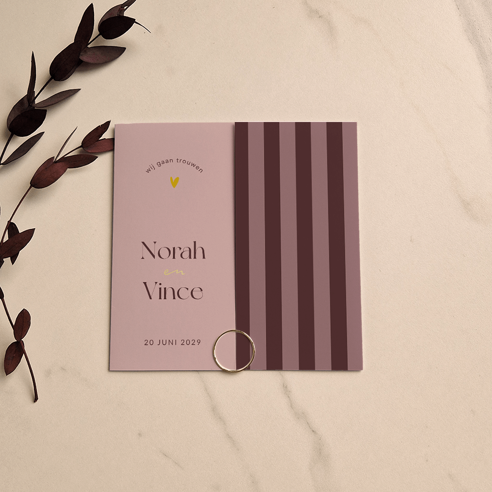 Op zoek naar een originele trouwkaart? Dan is deze hippe trouwkaart met luikvouw en goudfolie zeker iets voor jullie! Op deze kaart kun je goed alle informatie voor jullie grote dag kwijt. De trouwkaart is origineel en bijzonder tegelijk door de theatervouw. Daarnaast heeft de huwelijksuitnodiging een luxe uitstraling door de glanzende goudfolie. Sluit dit luikkaartje met een hippe ronde paperclip. De paperclip wordt niet standaard meegeleverd maar kan hier worden besteld.| Totaalprijs: 0 |