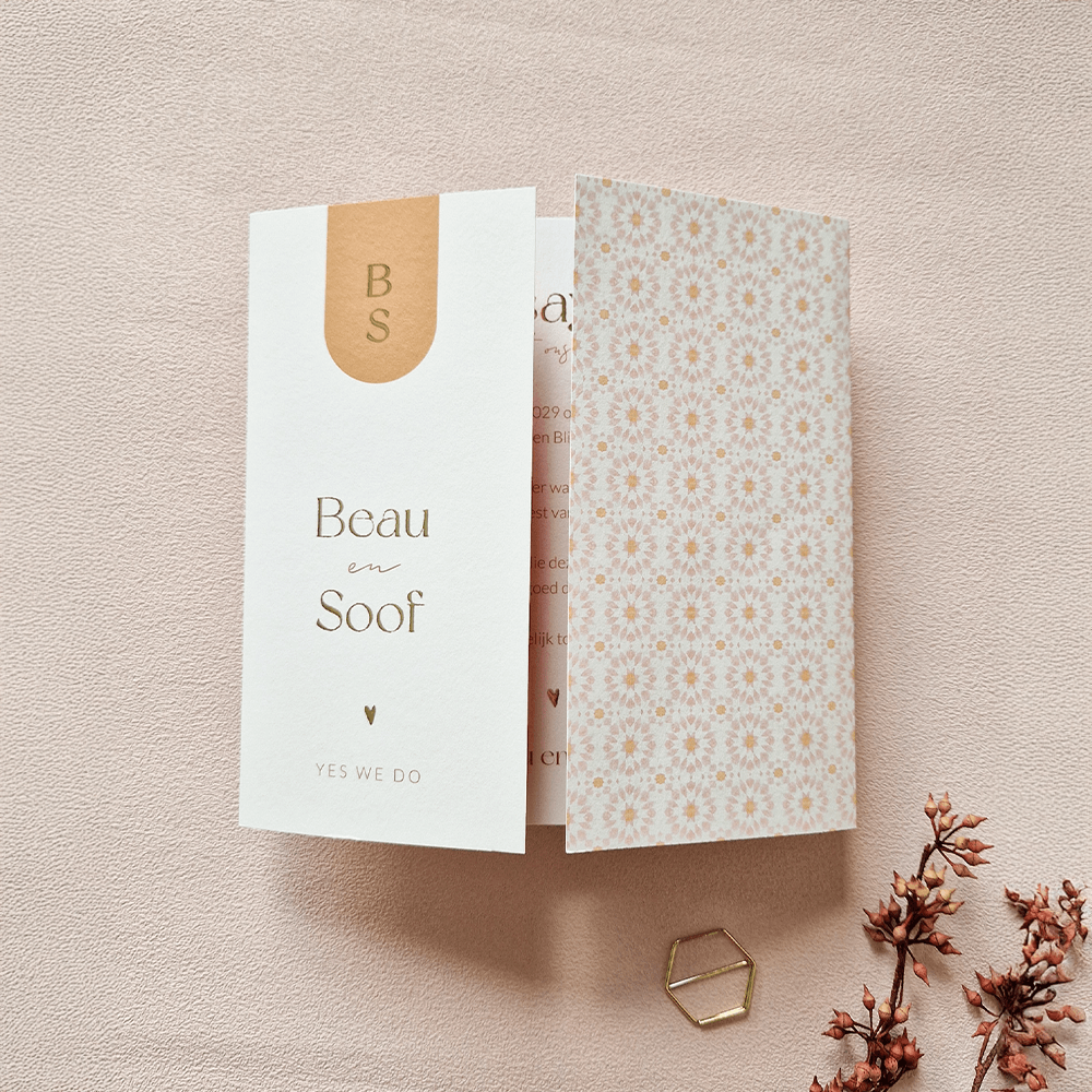 Trendy queer trouwkaart met luikvouw voor een vrouwelijk bruidspaar. Deze trouwkaart is origineel en bijzonder tegelijk door de theatervouw. Daarnaast heeft de huwelijksuitnodiging een luxe uitstraling door de glanzende goudfolie. Op deze kaart staat de tekst 'we say yes' met een mediterraans patroon en ruimte voor een eigen foto. Sluit dit luikkaartje met een mooie gouden paperclip.| Totaalprijs: 0 |
