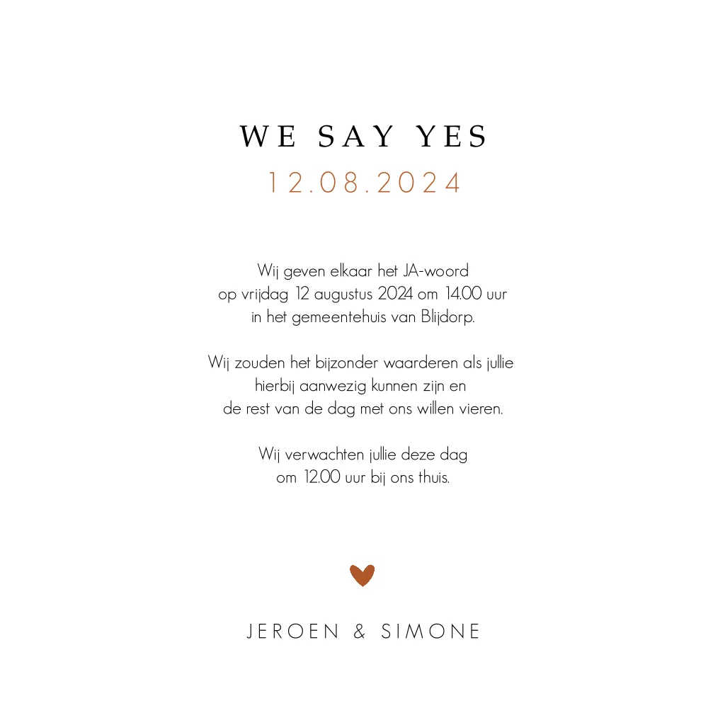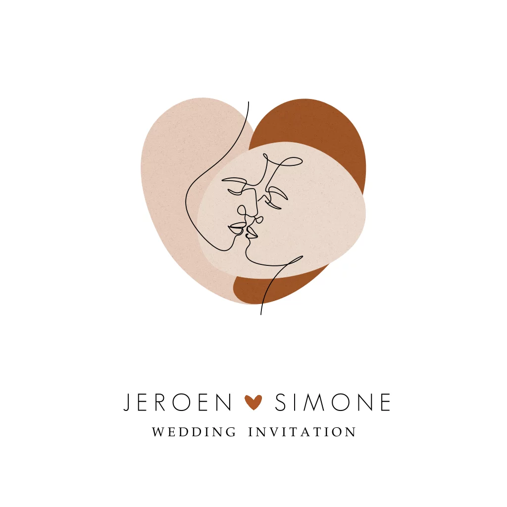 Mooie trouwkaart met abstracte vormen en trendy kleuren. Op de voorzijde van deze huwelijksuitnodiging staat een abstract hart met daarin een one line drawing van een liefdeskoppel. De namen van het bruidspaar staan in een strak lettertype met in het midden een klein hartje. Deze huwelijksuitnodiging is overwegend wit en oogt daardoor clean. Pas deze kaart naar je eigen smaak aan in de editor en combineer met een mooie envelop om het helemaal af te maken.