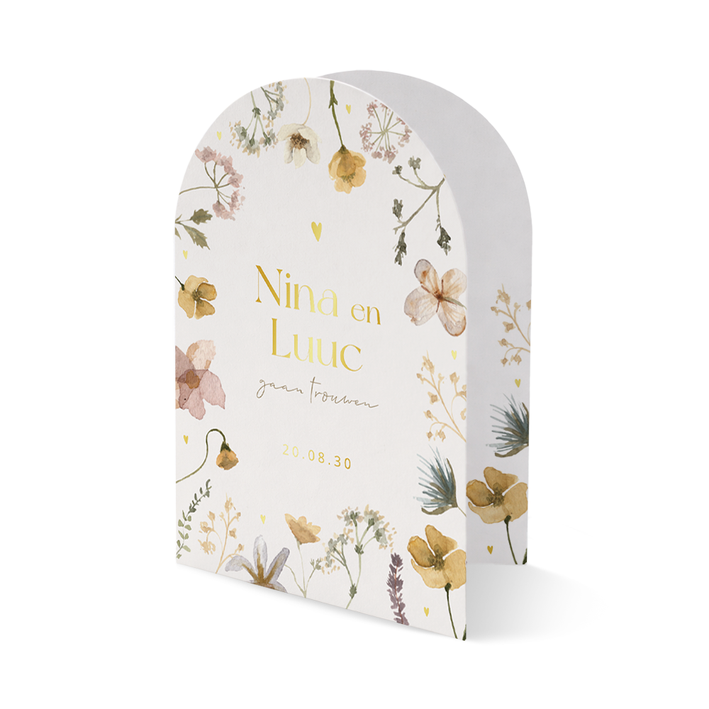 Romantische trouwkaart met bloemen en hartjes. Deze trouwuitnodiging heeft een dubbele boogvorm wat het kaartje helemaal uniek maakt. De glanzende goudfolie maakt het geheel helemaal af. Pas deze kaart naar je eigen smaak aan in de editor en combineer met een mooie envelop en sluitzegel om het helemaal af te maken.