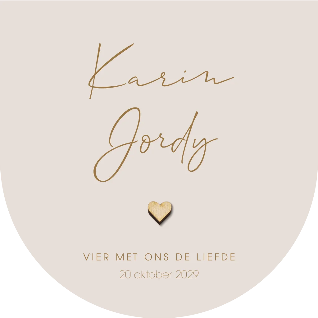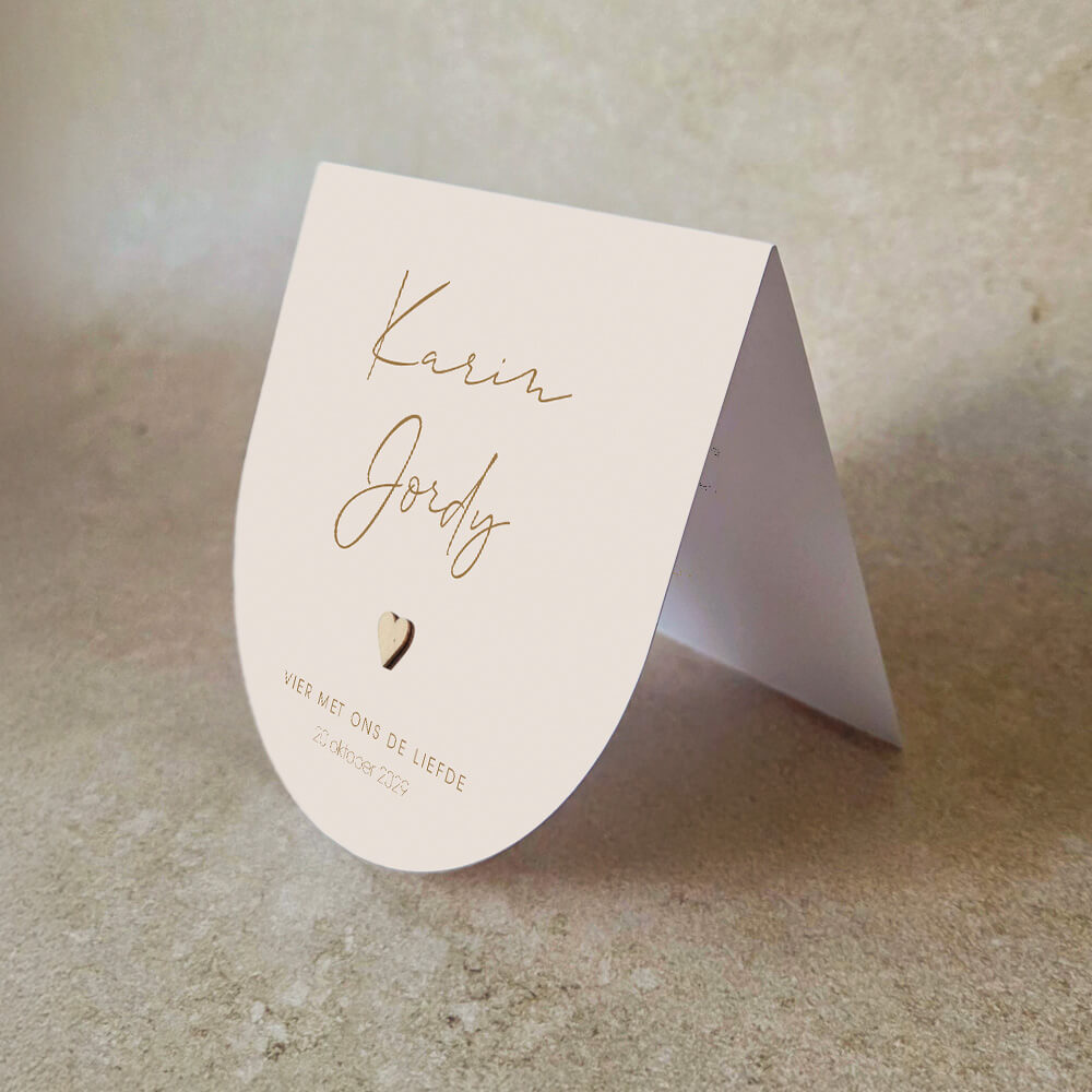 Op zoek naar een unieke trouwkaart? Zoek niet verder! Deze trouwkaart is speciaal door de aparte vorm én het echte houten hartje. De voorkant van de huwelijksuitnodiging is rond en de achterkant vierkant. Dit geeft een speels effect. Je kunt deze kaart zelf gemakkelijk bewerken, opslaan en bestellen. Vragen of wensen? Laat het gerust weten, wij helpen je graag.