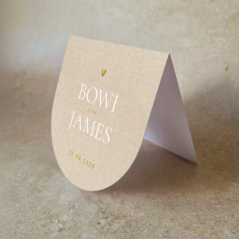 Aparte vormen trouwkaart met foliedruk. Deze trouwkaart heeft een originele en luxe uitstraling door de speciale vorm, een afgeronde voorkant en vierkante achterkant. Deze organische vorm zorgt voor een dynamisch effect, vooral wanneer de huwelijksuitnodiging opengeklapt staat. De trouwkaart heeft een beige linnenlook achtergrond waar de witte letters en goudfolie mooi op naar voren komen.