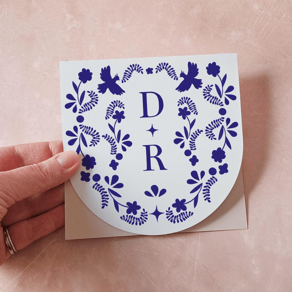 Originele trouwkaart in aparte vorm met een afgeronde voorkant en vierkante achterkant. Deze organische vorm zorgt voor een dynamisch effect, vooral wanneer de trouwkaart opengeklapt staat. Het ontwerp oogt verfijnd, creatief en perfect voor wie net even iets anders wil dan standaard drukwerk. Op het ontwerp zie je een blauw folklore bloemenpatroon met vogels. Je kunt de kaart naar je eigen wensen aanpassen in de editor. Hulp nodig bij het ontwerpen? Neem contact met ons op!