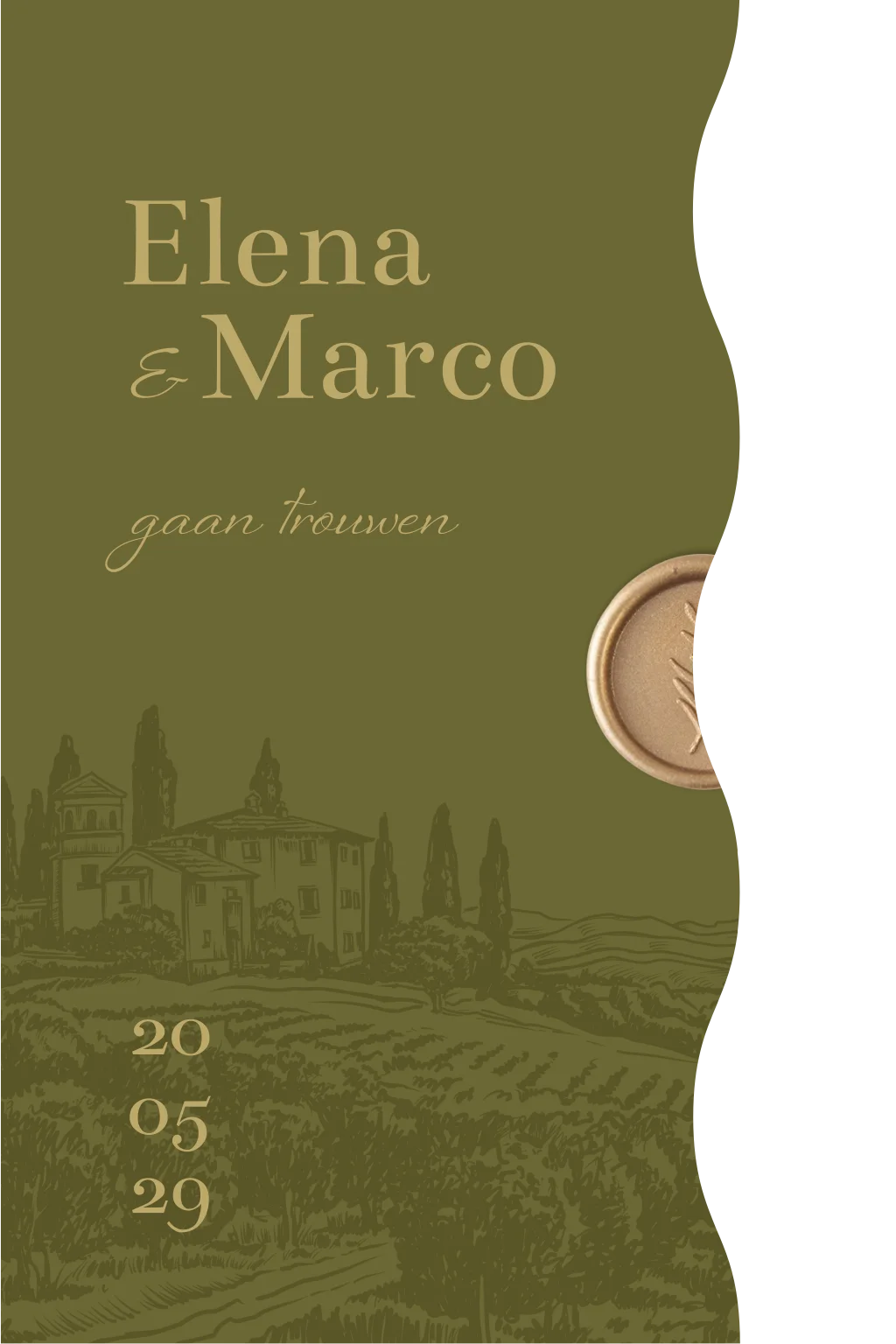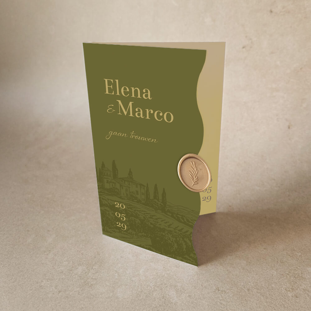 Prachtige trouwkaart met Italiaanse uitstraling met een tekening van een Toscaans landschap. Deze trouwkaart heeft een organisch design met golvende rand. De toevoeging van de lakzegel geeft een stijlvolle uitstraling aan deze aparte vormen trouwkaart.