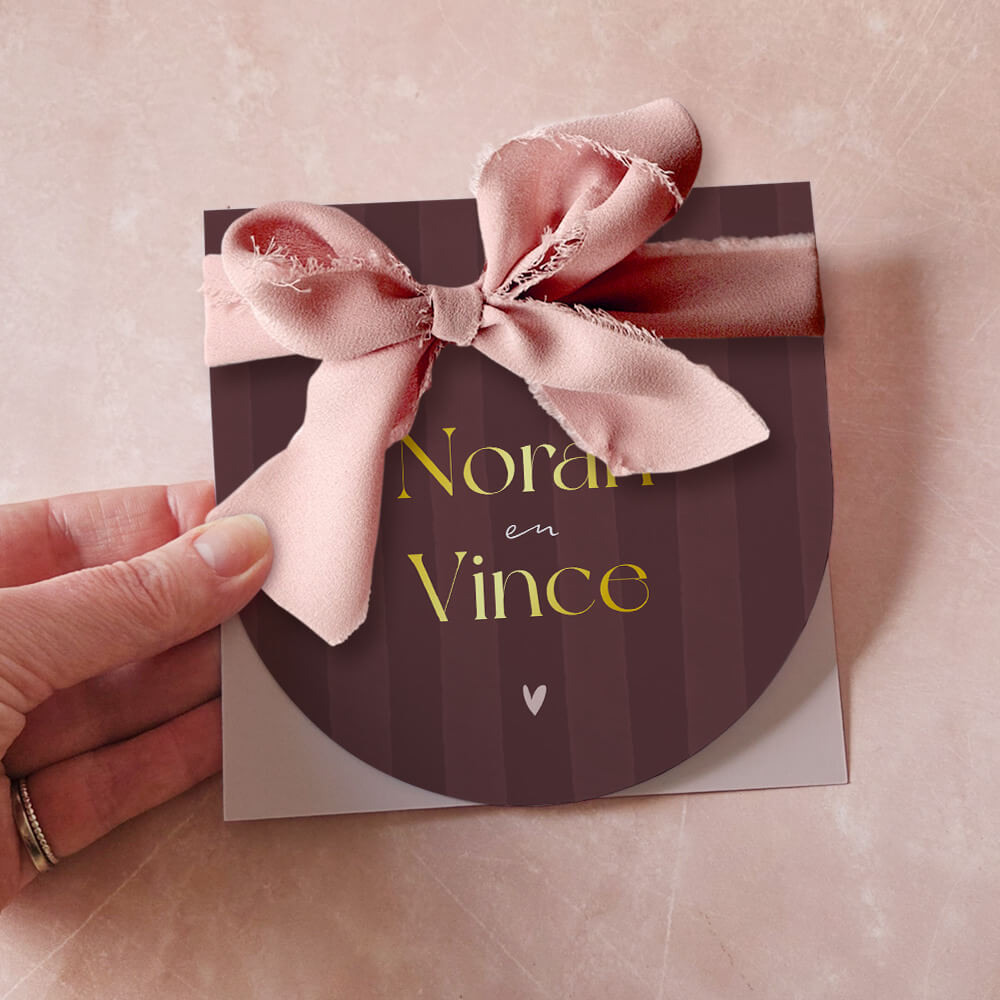 Unieke en elegante trouwkaart in aparte vorm. Deze trouwkaart heeft een bijzonder ontwerp met een ronde voorkant en vierkante achterkant. Dit geeft een speelse en moderne uitstraling. De burgundy kleur, strepen en het strikje zijn helemaal volgens de laatste trend. Een hippe en trendy trouwkaart! De goudfolie geeft een extra luxe afwerking.