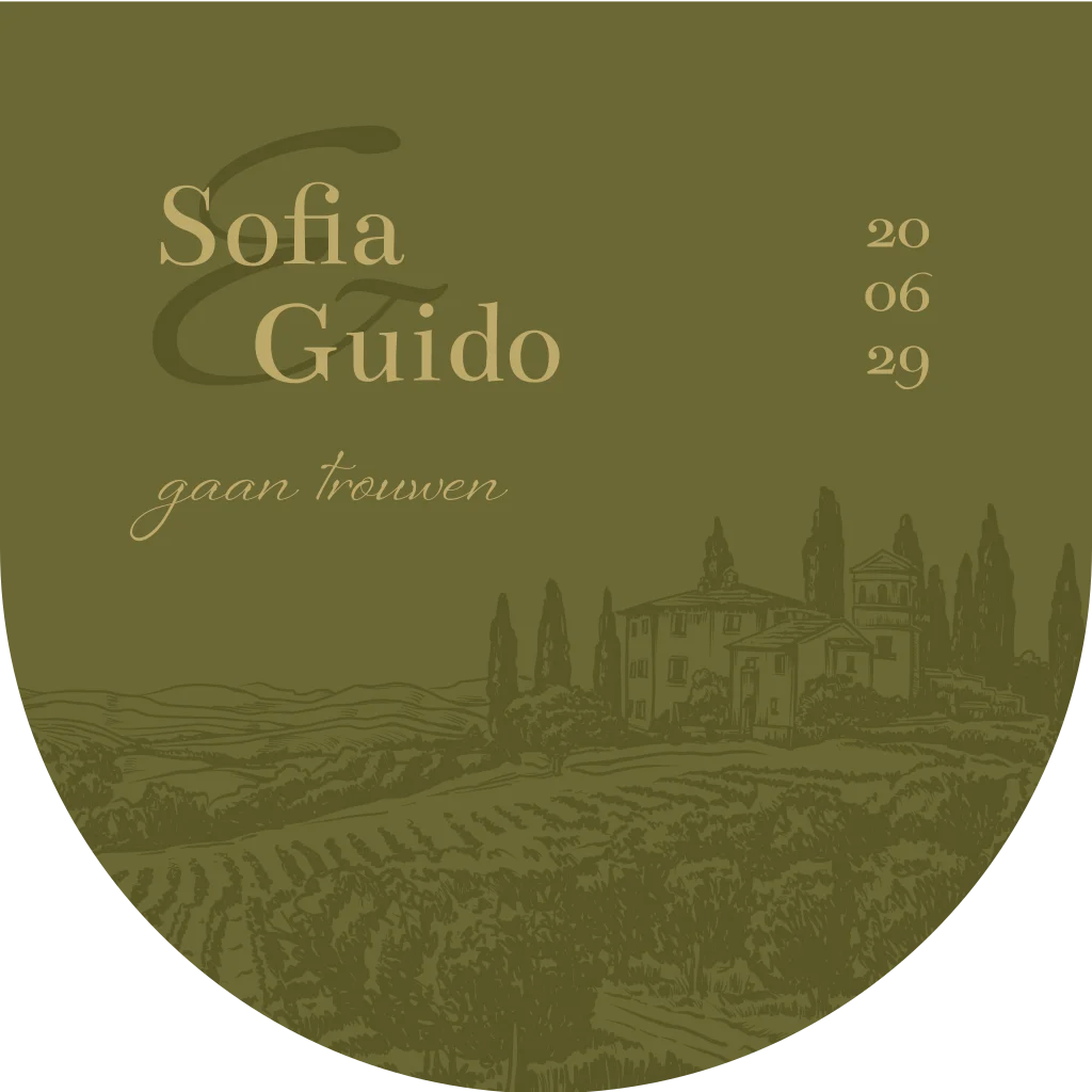 Originele trouwkaart in aparte vorm met een afgeronde voorkant en vierkante achterkant. Deze organische vorm zorgt voor een dynamisch effect, vooral wanneer de trouwkaart opengeklapt staat. Het ontwerp oogt verfijnd, creatief en perfect voor wie net even iets anders wil dan standaard drukwerk. Op het ontwerp zie je een Toscaans landschap in groene kleuren. Een unieke trouwkaart, perfect voor een bruiloft in Italiaanse sferen! Je kunt de kaart naar je eigen wensen aanpassen in de editor. Hulp nodig bij het ontwerpen? Neem contact met ons op!