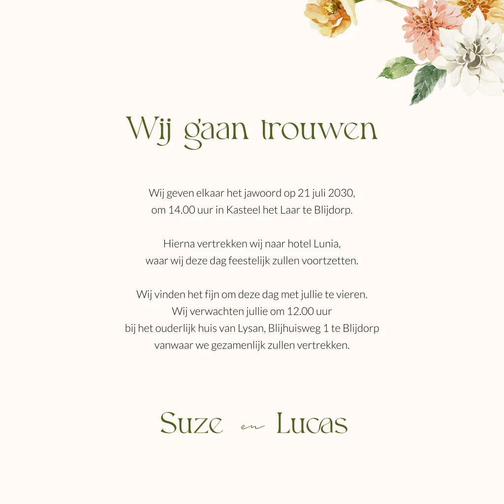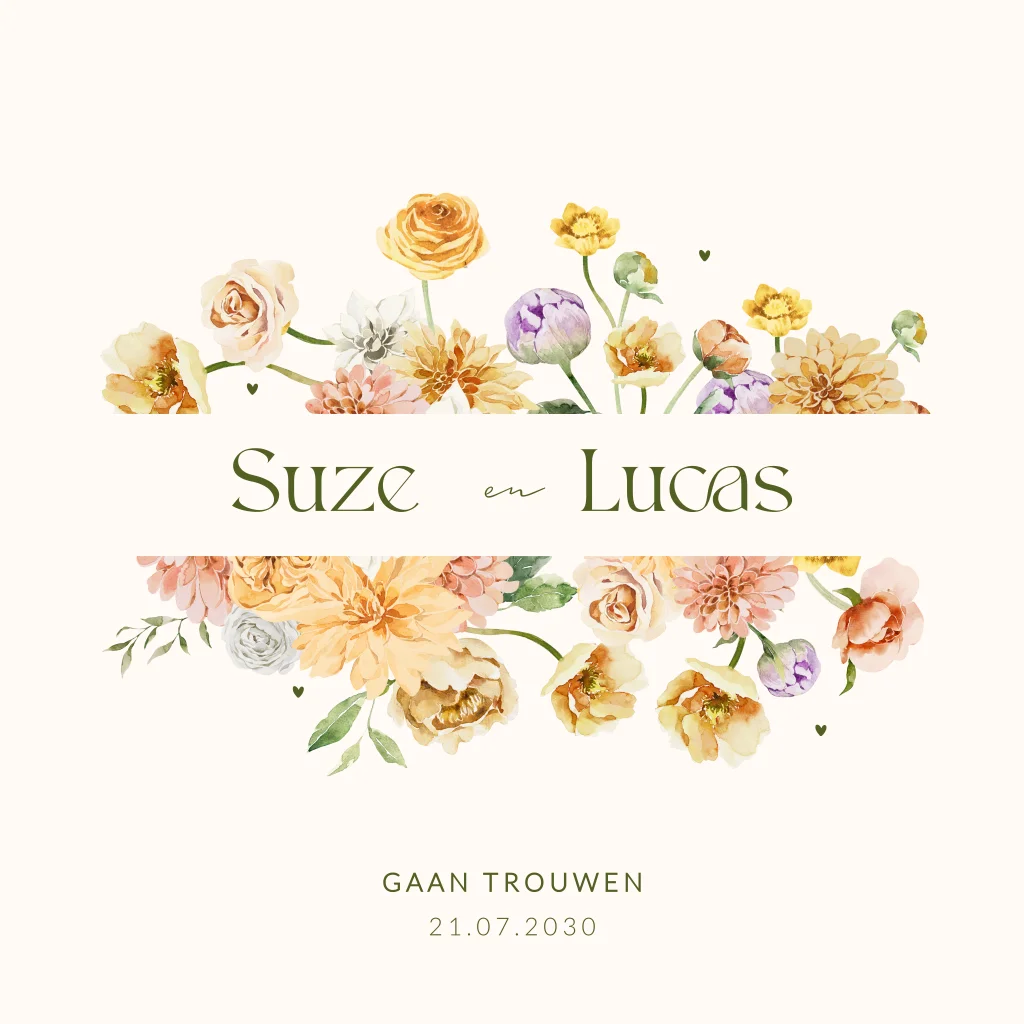 Romantische trouwkaart met bloemen en hartjes. Voor de bloemen staat een rechthoekig kader waarin de namen van het bruidspaar. Pas deze huwelijksuitnodiging geheel naar eigen wens aan in de editor, zodat het precies bij jullie bruiloft past. Vragen? Laat het ons weten!
