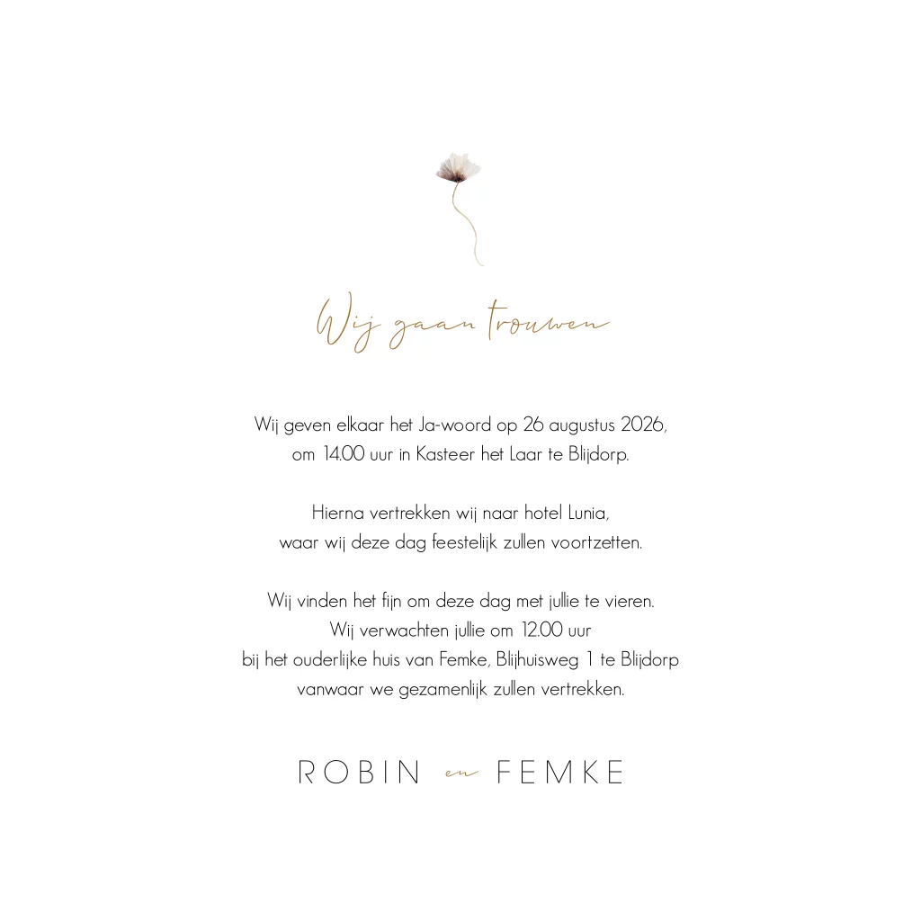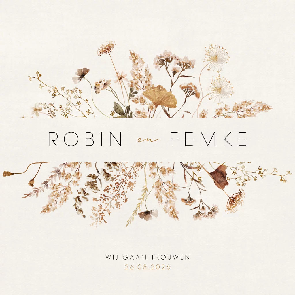 Fraaie trouwkaart met een kader met verschillende, kleine aquarel bloemetjes. Deze trendy, beige huwelijksuitnodiging heeft een linnenlook achtergrond. In het kader staan de namen van het bruidspaar. Je kunt deze kaart zelf bewerken in de editor en naar je eigen wensen aanpassen.