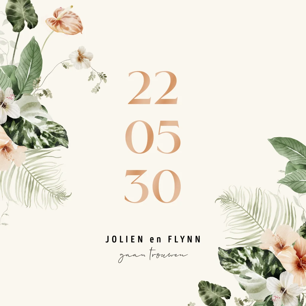 Trouwkaart met botanische bloemen en letters in hoogglans