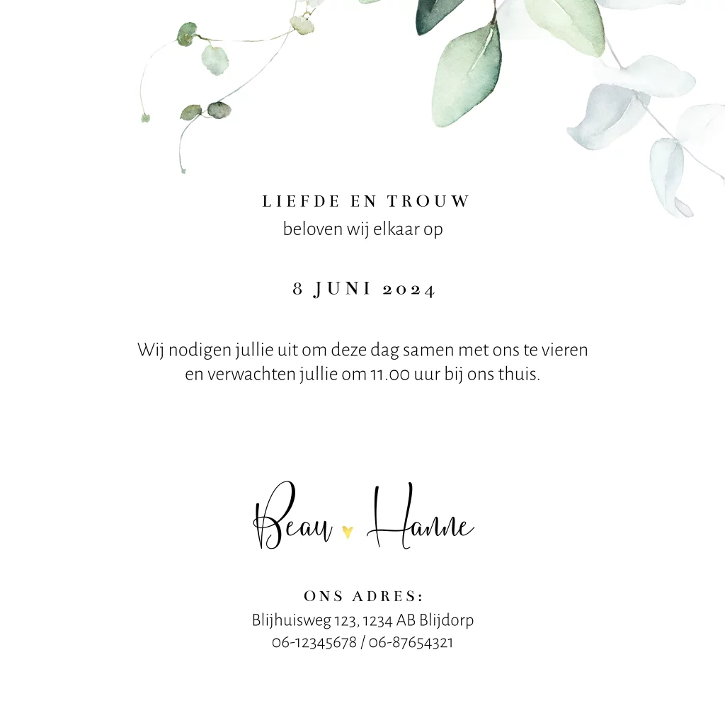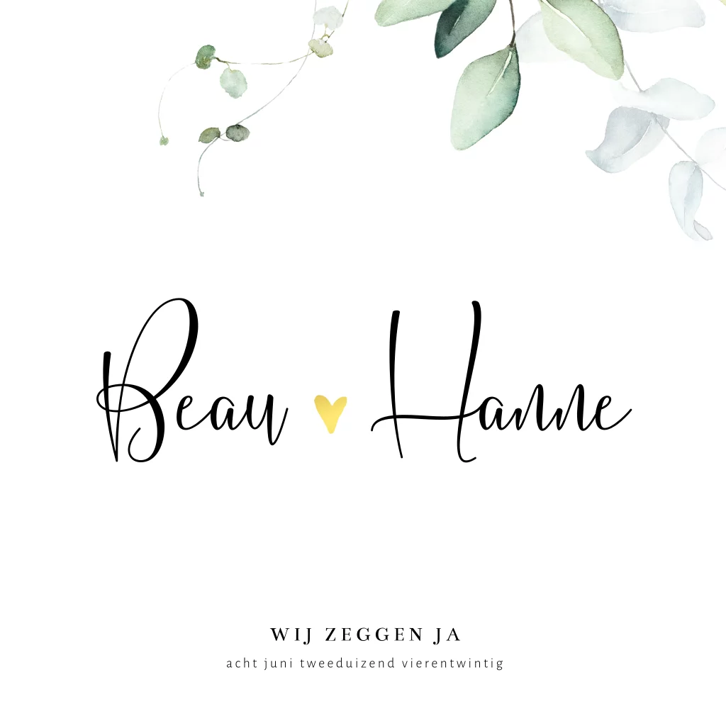 Mooie trouwkaart met een rustige uitstraling. Op deze huwelijksuitnodiging staan enkele aquarel eucalyptus takjes in zachte groene tinten en een goudkleurig hartje. De namen van het bruidspaar staan in een sierlijk lettertype. Maak van deze kaart je eigen persoonlijke huwelijksuitnodiging. Pas de teksten en lettertypes naar je eigen smaak aan in de editor.