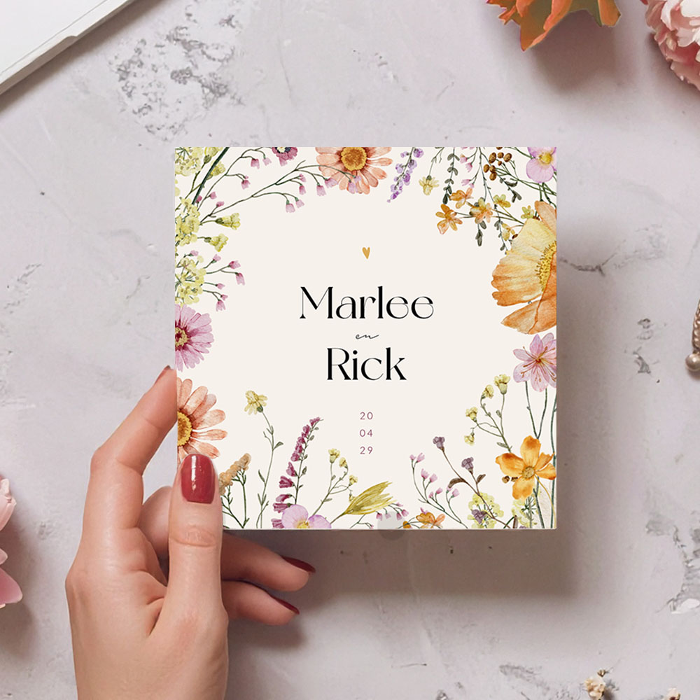 Een kleurrijke trouwkaart voor jullie bruiloft! Deze trouwkaart heeft een beige achtergrond met kleurrijke aquarel veldbloemen. Pas dit kaartje naar eigen wens aan in de online editor voor jullie persoonlijke touch. Hulp nodig? We helpen je graag!