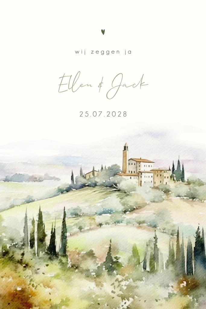 Mediterraanse trouwkaart met een aquarel van een mediterraans landschap van Toscane. Deze trouwkaart is perfect voor als jullie van Italië houden, een mediterraanse bruiloft geven of in Toscane gaan trouwen. Maak af met een mooie donkergroene envelop.
