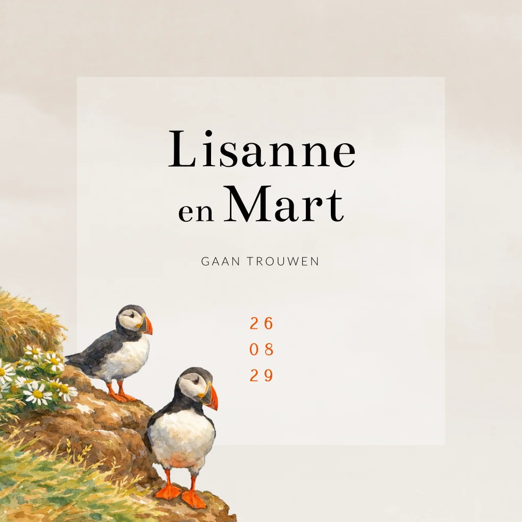 Trouwkaart met aquarel tekening van koppeltje papegaaiduikers