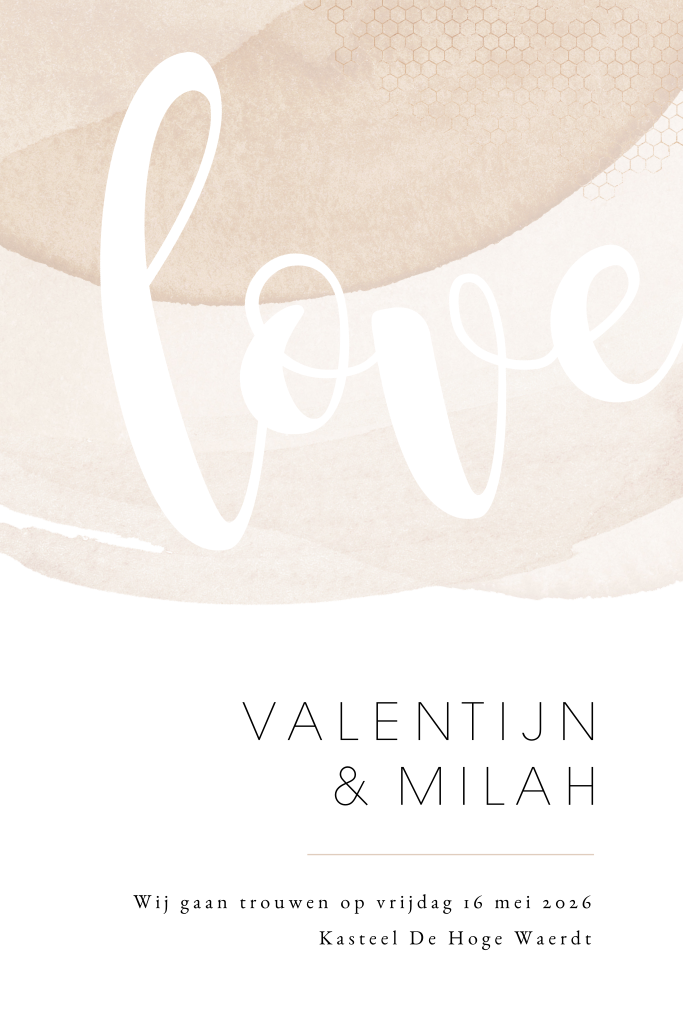 Mooie trouwkaart met aquarel vegen in zachte roze tinten. Het woord "Love" staat groot op de voorzijde in sierlijke letters. Helemaal bovenaan een klein stukje honingraat patroon.