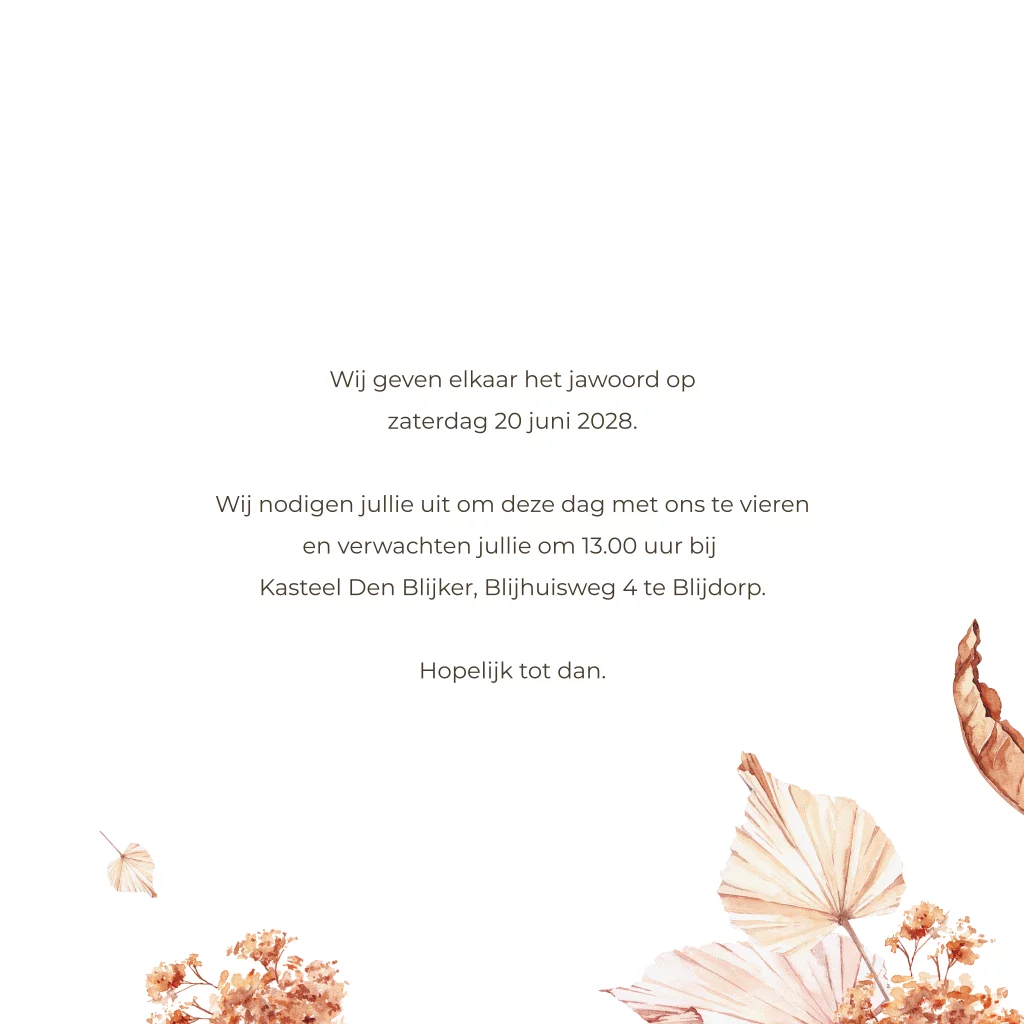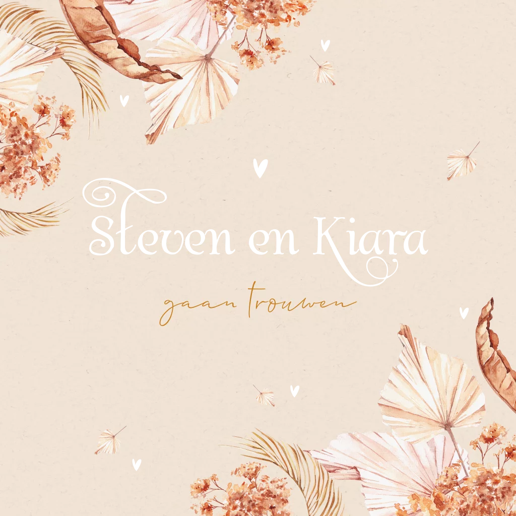 Stijlvolle trouwkaart met bloemen in zachte roze/beige kleuren. De namen van het toekomstige bruidspaar en de hartjes worden gedrukt in écht goudfolie wat een luxe touch geeft aan deze islamitische bloemen uitnodiging. Pas de kaart geheel naar eigen wens aan in de editor, zodat jullie Arabische trouwkaart precies aan jullie wensen voldoet. Maak jullie fantastische trouwkaart af met een bijpassende envelop.