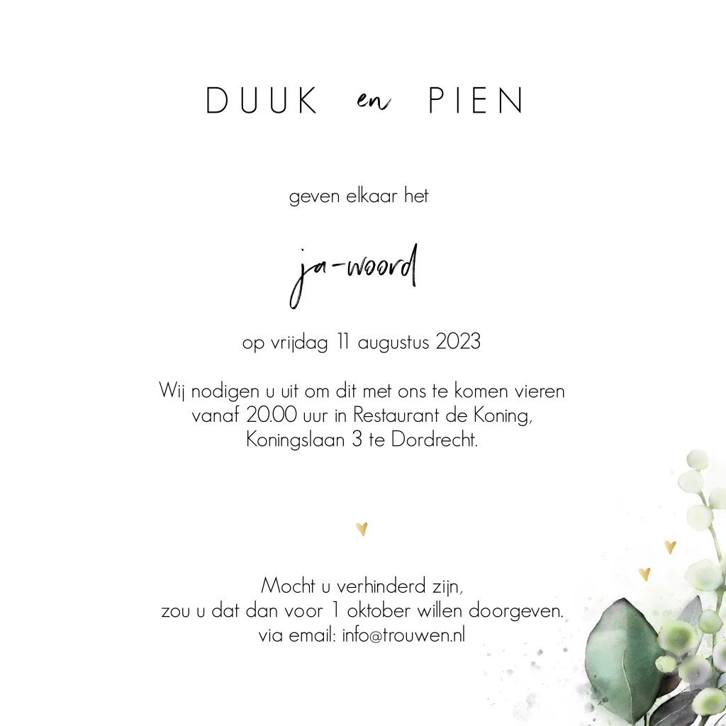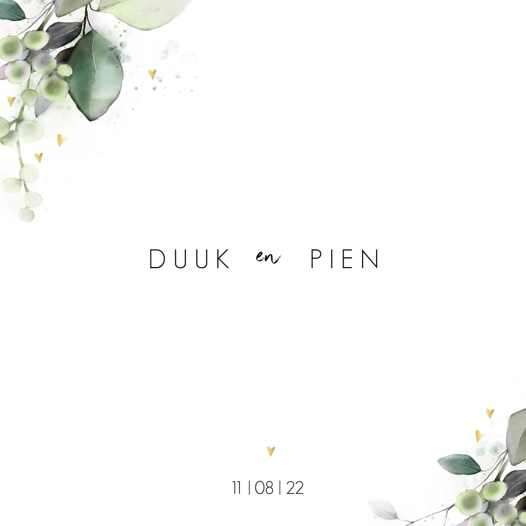 Rustige botanische trouwkaart met een cleane uitstraling en kleine goudkleurige hartjes. Op deze trouwkaart staan de namen van het bruidspaar met strakke letters geschreven, maar het woordje en met een sierlijke handwriting letter. Het botanische blad in de hoeken van de huwelijksuitnodiging worden extra versiert door de kleine goudkleurige hartjes. Deze kaart is onderdeel van onze trouwhuisstijl Basic Botanisch, maar zeker ook apart te bestellen.